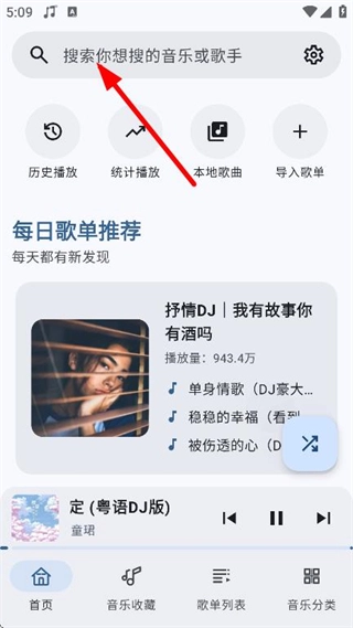 在音乐软件的首页,点击页面顶部的搜索框,即可进入搜索页面。