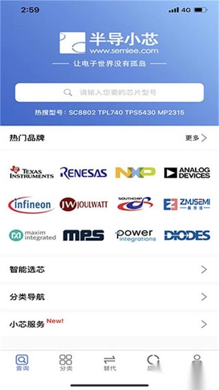 进入查询页面顶部搜索框,输入芯片型号或选择热门标签筛选。