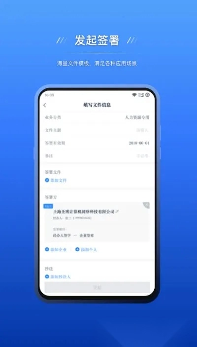 **模板资源丰富**:平台配备海量文件模板,可适配各类应用场景需求,系统会自动留存发起记录,同时支持添加抄送人。