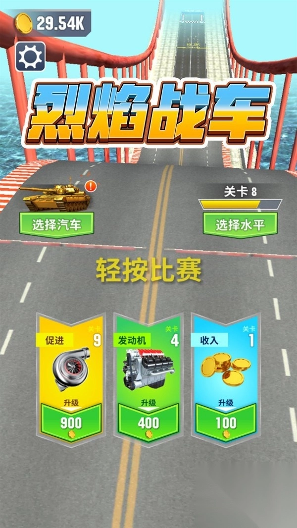 2、在主界面点击【轻按比赛】,选择【关卡1】以及与之对应的水平,随后开启城市赛道的竞速之旅。