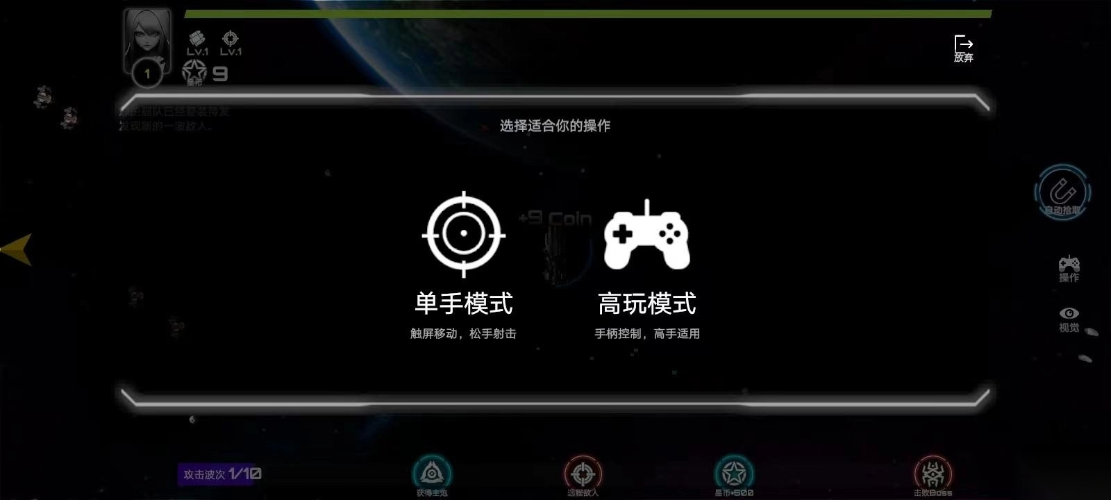 开始游戏选择单手或高玩操作模式,单手简化适合新手。十波敌人需全部击败,战舰自动识别射击。