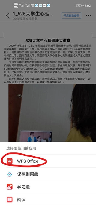 当选择用其他应用打开时,系统会弹出应用选择界面,此时选择WPS Office即可。