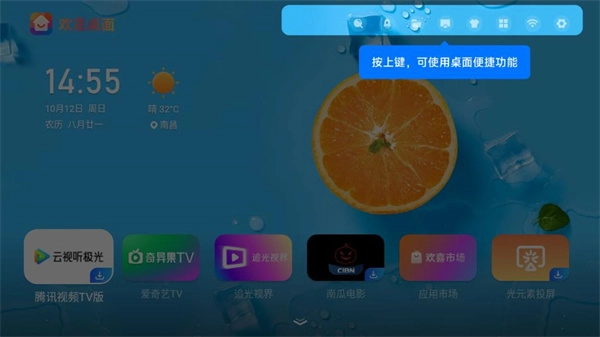 打开欢喜桌面纯净版软件时会出现新手引导,通过遥控器上键能够选择便捷功能。