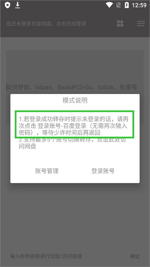 若检测到未登录状态,需点击提示框内的“登录账号”按钮完成二次登录操作(此过程无需重复输入密码)。