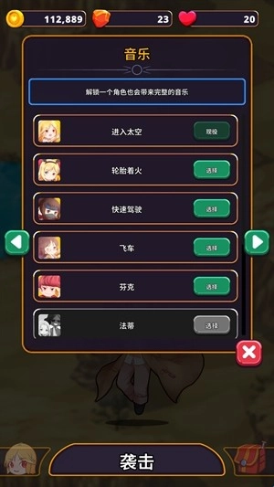 点击音乐选项,玩家就能在这里自由挑选已解锁角色对应的音乐,将其设置为背景音乐。