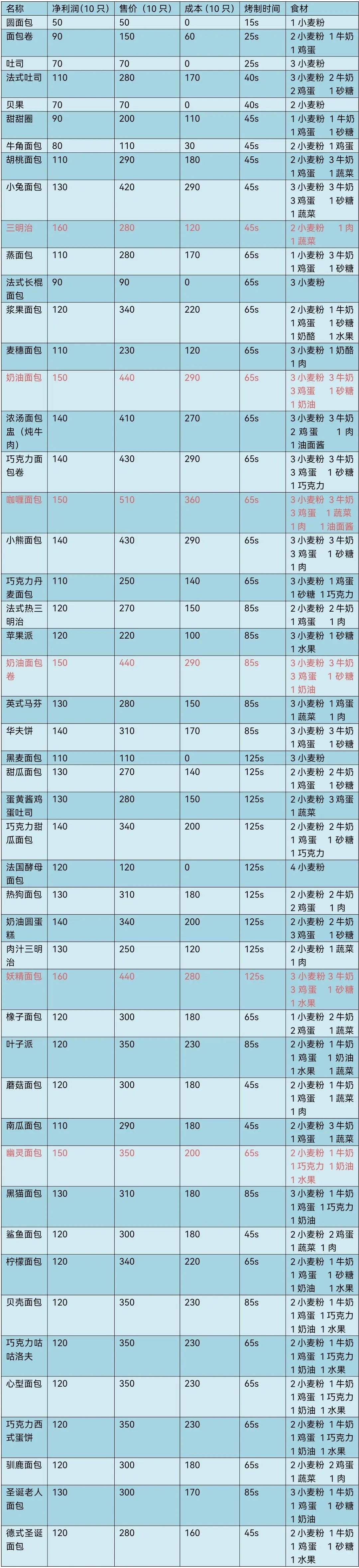 三明治与妖精面包净利润最高(160金币),其次是奶油面包和咖喱面包(150金币)。建议优先研发高收益产品: