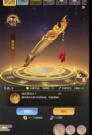 召唤界面每周免费机会,十连消耗880元宝。配置界面可强化基础属性,升星需消耗同名称法宝碎片。战斗中使用需消耗灵气值,灵气恢复速度受角色等级限制。