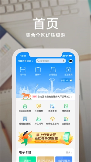 【首页】汇聚了使用频率高、用户关注度较高的服务功能,用户也能根据自身需求自行定义这些功能。