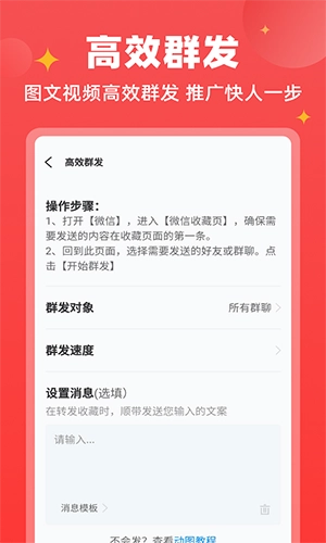 消息群发功能支持标记需发送的联系人或群组,一键即可快速完成群发操作。