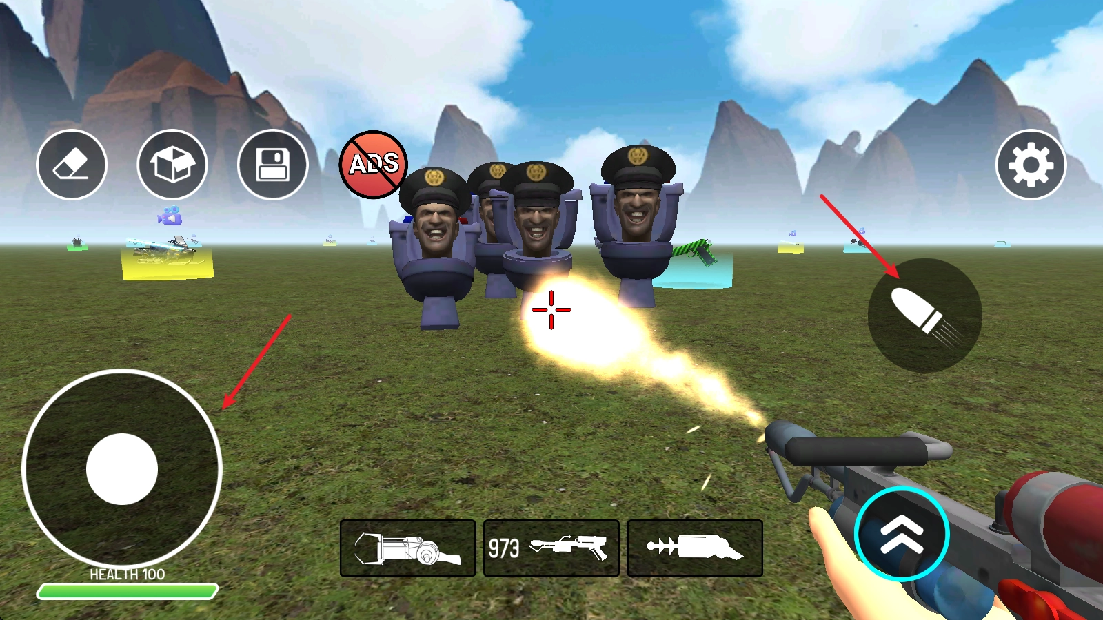 在游戏里,点击左下角的第一件武器并进行发射,即可在场景中添加敌人。