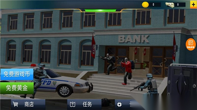 在狙击手的日常游戏主界面领取【免费游戏币】和【免费黄金】,然后点击【开始游戏】,为银行劫案任务做好准备。