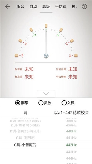 其中,听音模式提供琵琶、三十六簧笙、三角钢琴、扬琴这4种基准音模式。