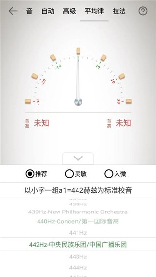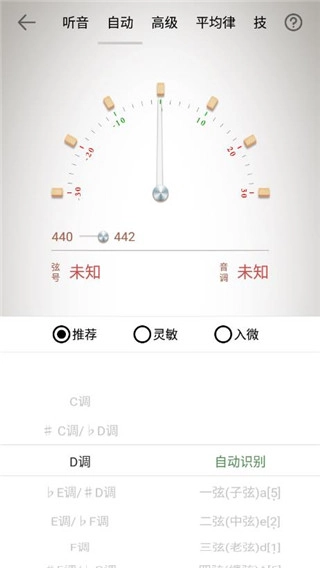 调音器配备了听音模式、自动定弦、高级调音、十二平均律校音以及琵琶技法这5种调音模式。