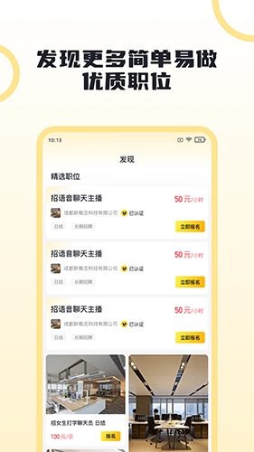 平台设有多种分类专区,点击选择匹配、宅家、日结、急聘等分类,就能查看对应的招聘信息。