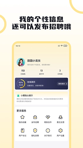 灵鹿招聘是一款优质的求职招聘软件,平台汇聚了海量岗位信息,能依据求职者的个人情况精准匹配职位,支持一键投递功能,求职者还可在线与HR直接沟通交流。所有入驻的岗位和公司均经过严格认证,大家可以安心求职。平台会精选岗位进行推荐,并根据用户的浏览动态实时更新推荐内容,用户也能自行设置筛选条件来查找心仪岗位;在招聘详情页,可查看公司介绍、联系方式、工作内容、工作地点等详细信息,还能一键报名该岗位;用户在线即可编辑简历,借助平台提供的模板完善简历内容,完成后一键投递,并且随时能查看公司对自己简历的浏览情况;同时,登录用户还可以编辑个人信息,包括昵称、头像、个人简介等,完善个人签名,让更多人了解自己。