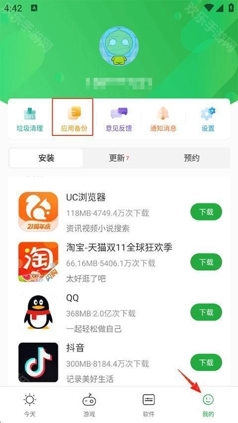 打开豌豆荚,点击我的-应用备份。