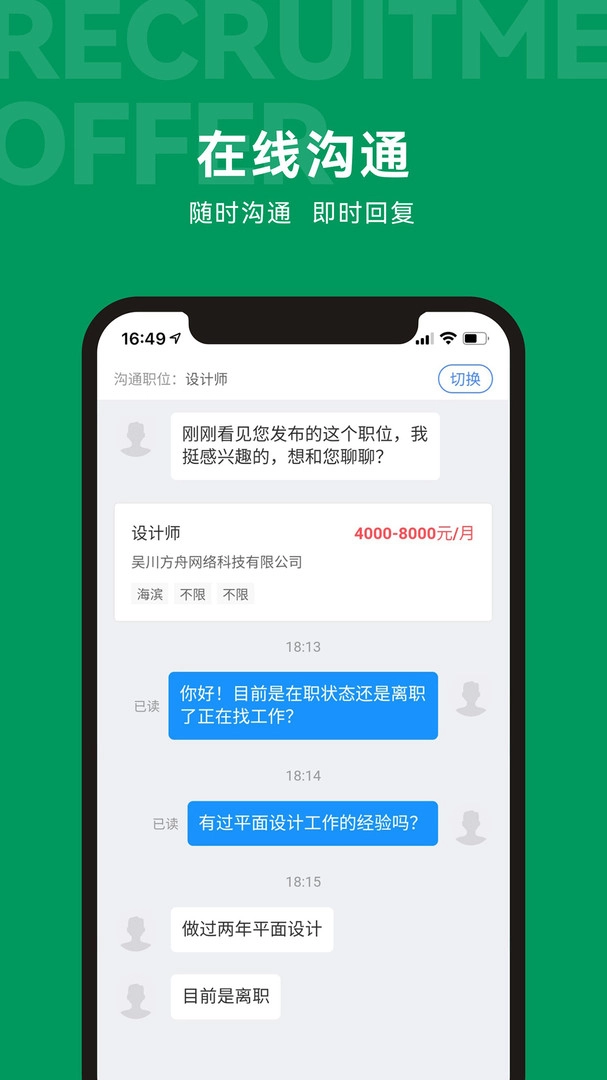 既满足企业招聘的需求,也兼顾用户求职的需要,企业能够精准地招到合适的人才,用户也可以便捷地找到工作,并且平台还支持通过线上沟通来确定面试时间。