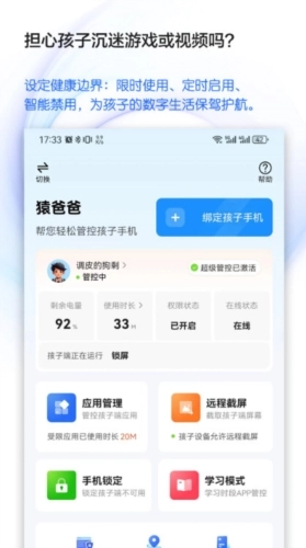 在快节奏的现代生活里,怎样合理规划孩子的屏幕时间,成了不少家庭要应对的一大难题。猿爸爸上网守护正是为解决这个问题而设计的,它借助一系列智能管理工具,助力家长们更妥善地平衡孩子的娱乐与学习时间。这款产品支持绑定孩子的手机,让家长能随时了解孩子手机的电量、使用时长,甚至可以远程锁定孩子的设备,从而保证孩子有足够的时间专注于学习或其他有意义的活动。另外,家长还能够管理孩子可使用的应用清单,防止孩子接触到不合适的内容。