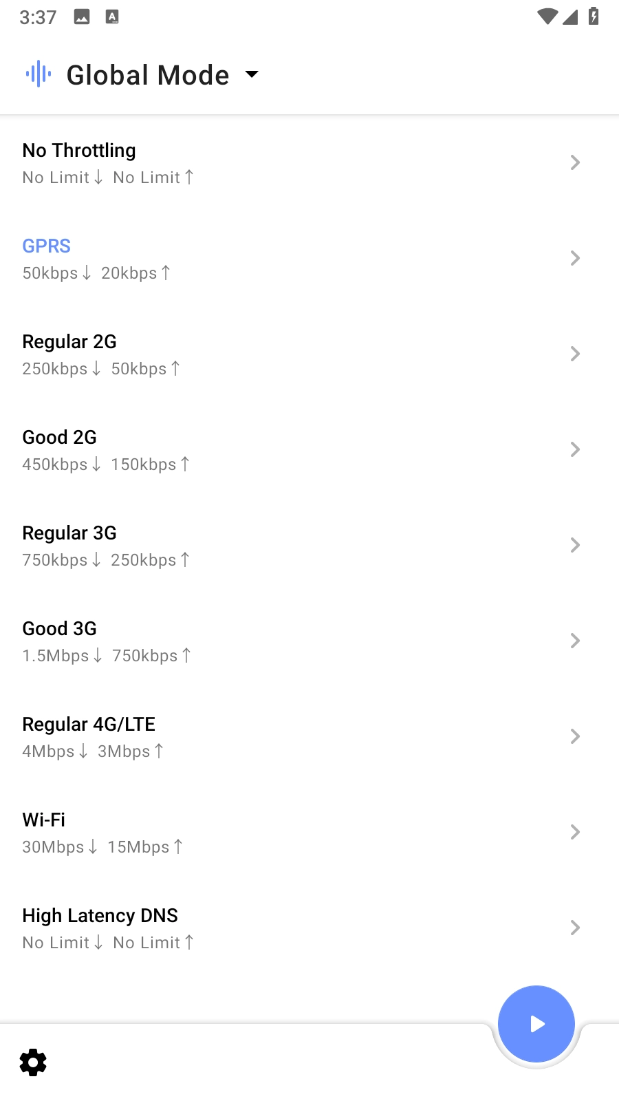 运行Throttly后,在主页面能够设置全局流量限制,涵盖GPS、2G、3G、4G、Wifi等方面的限制。