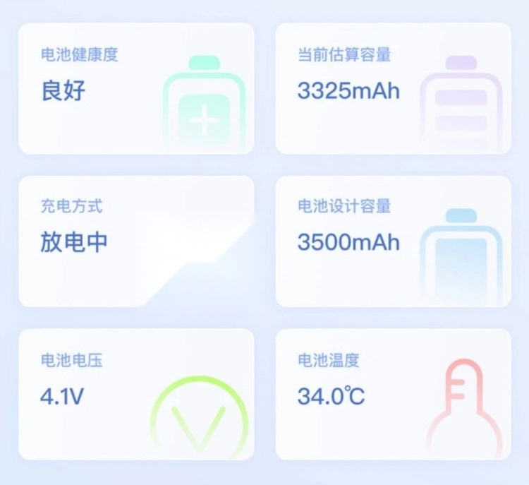 展示当前电量百分比、电池温度、电压以及健康度等关键参数。