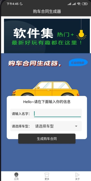 购车合同生成器是一款很受用户欢迎的手机生成类软件,它能帮用户一键生成各类购车合同,无论是玛莎拉蒂、保时捷还是法拉利,都能轻松生成,堪称装13的得力工具,喜欢这款软件的用户,别犹豫啦。