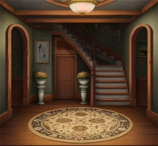 走进大厅后,发现暂时无法直接前往楼上,只能通过其他路径绕行上去;地下室的门也处于锁闭状态,因此目前只能先往左右两侧探索(留意墙上那四幅鸟的画作,它们的朝向在后续会派上用场)。