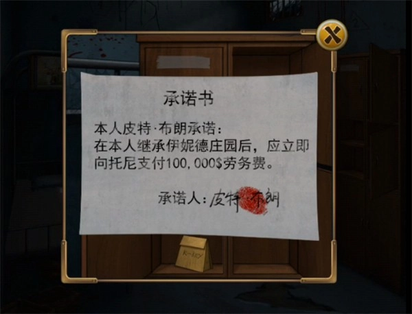 用这把钥匙打开之前从房间床底下掏出来的箱子,能拿到一串钥匙,还能找到伪造的遗产继承文件。这里已经探索完毕,我们上楼吧。