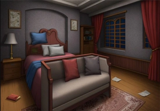 进入卧室后,先简单探索一下:首先在窗帘后面能找到一个小红球,这样就凑成两个配套的了;接着查看后方的书架,整理后会看到两个圆孔,把两个红球放进去(注意上方瓶子里有一把一字螺丝刀,记得拿走)。然后拿起床尾沙发上的抱枕,会发现一节电池,另一节电池在床头柜最下面的抽屉里。