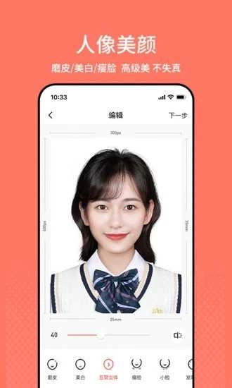 支持美肤、美白、瘦脸三种编辑模式。拍摄证件照时,可借助美颜调整功能,直接修饰人像的肤色与脸型等,使照片呈现出更美丽自然的效果。