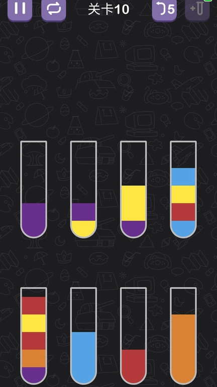 只有相同颜色的液体才能相互倾倒,还有很多有趣的玩法等着你来探索体验。