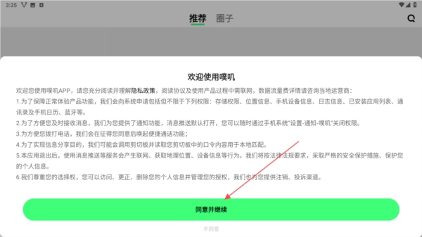 首次使用噗叽时,请仔细阅读界面上的隐私政策等相关内容,然后点击【同意并继续】按钮以开始使用。