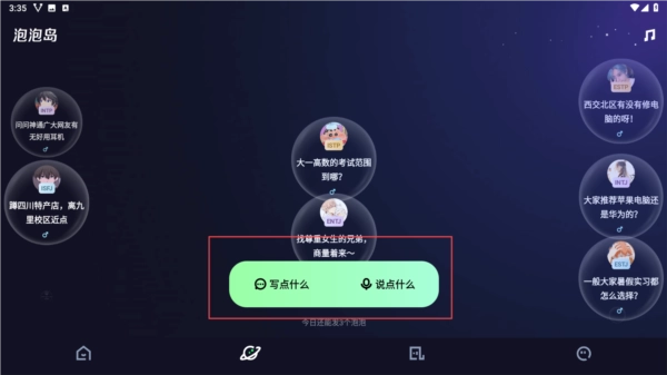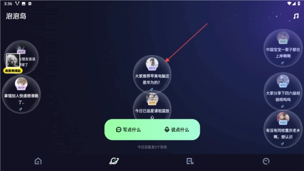 进入泡泡岛界面后,点击【写点什么】或者【说点什么】就能发布自己的内容啦。