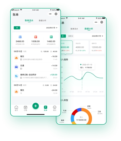 你每一笔记账的消费都会在账单页面呈现,同时还能查看相关的数据分析。
