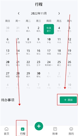 我们点击行程,在这里点击添加,就能把后续重要的事情记录进去,到时间后软件会自动提醒你。