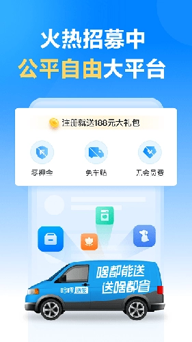 注册司机无需缴纳会员费、车贴费和押金,平台开城首月不抽取佣金,相比同类型送货平台,司机拥有更自由的工作模式,运营压力更小。