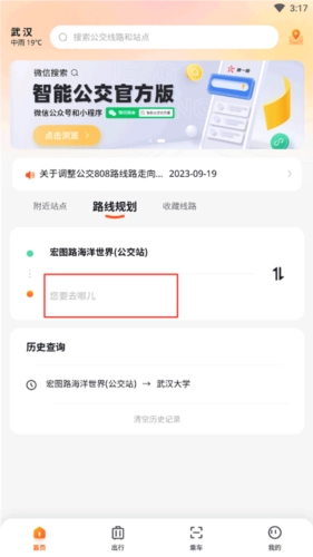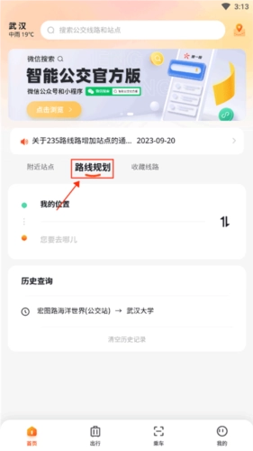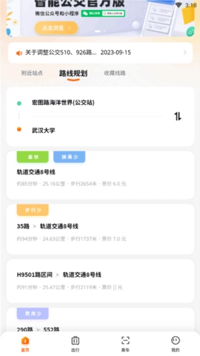 武汉智能公交系统中,始发站既可自动定位当前所在位置,也能手动输入站点名称;输入目的地后,系统会搜索并展示公交换乘的具体方案及其详细信息。
