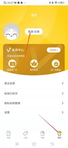 进入小说仓库后,先点击右下角的“我的”,接着点击上方的“登录/注册”按钮。