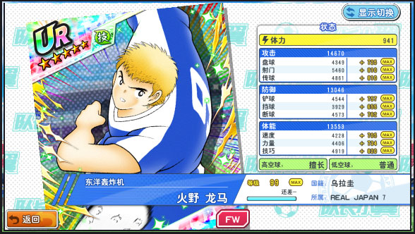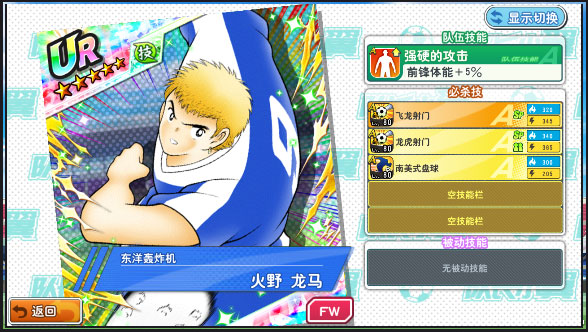 2、队长大空翼,同样,数据很好,甩赠送的强袭大空翼几条街。但是这样直接会让你在初期少一个SSR出阵(同名球员不能同时上场),此外缺乏防守技也是大问题。