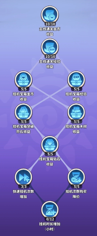 快速挂机次数增加,和挂机次数购买降价,建议点满!因为这两项内容都是长期收益。挂机次数降价点满可降低20%的钻石消耗。