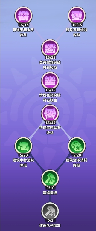 部落发展上面部分都是宝箱收益,按照顺序逐一点满即可,特别是低级宝箱,每天要开的量很大,点满可增加30%收益。