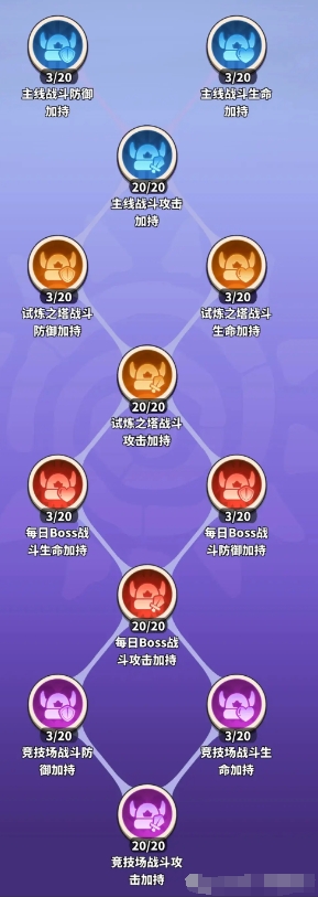战斗基础部分建议优先将主线战斗攻击、试炼之塔战斗攻击点满,能够增加10%加成。其次再点满每日boss战斗攻击、竞技场战斗攻击。