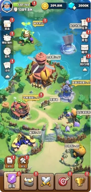 玩家们在通关1-10之后,【部落】模块将被开启,在这一模块中,玩家可以进行英雄征兆,通过建造不同种类的建筑物来打造士兵演练场等,来提升自己的综合实力,也可以让部分英雄打工挂机来获得金币钻石等游戏必需品。