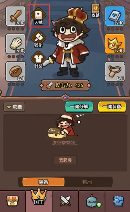 在此处,你能够查看国王当下的天赋属性,以及因天赋解锁的机制。点亮天赋需要消耗通过战斗获取的天赋点,以及一定数量的金币。获取方式颇为简单,多参与战斗即可。