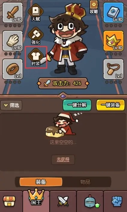 轻点下方的王冠,进入【国王】详情页面,即可查看当前国王的装备。国王作为可不断成长的主角,在战斗初期能提供颇为坚实的基础战斗力,是重点培养对象。