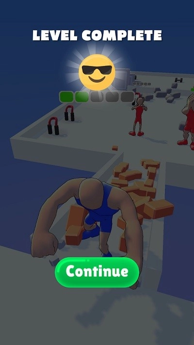 1、身形瘦弱的角色捡起地上的健身器材进行锻炼,当角色头顶上方的进度条满格时,便能击碎障碍,进入到下一个环节。