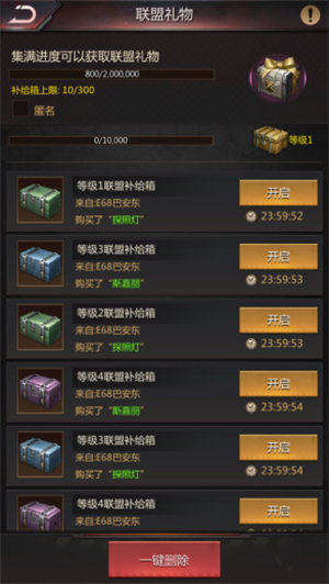 ①加入联盟后,如果盟友购买礼包,全盟人员都能领到赠送的礼包,请记得及时领取,集满进度后还能获取联盟礼物。