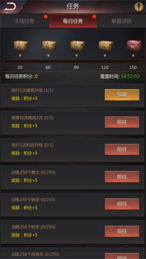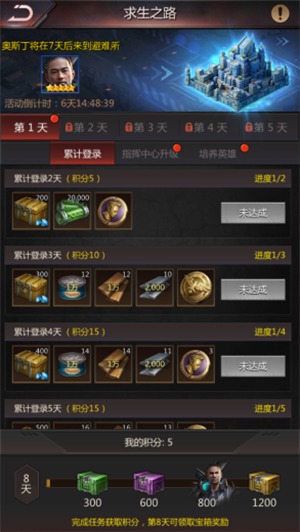 3、“求生之路”是我们前期可以必定获得奥斯丁的活动,所以我们要多留意里面的任务内容,完成任务获取积分,在结束时尽可能的获取1200的积分奖励。建筑队列的安排还是不变的情况下今天的指挥中心可以来到15级,且10个新兵基地能平均等级能到10级左右。