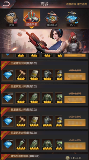 2、购买建筑研发套。根据自己的情况购买三星、四星甚至五星的建筑研发套,我的建议是四星的建筑套+三星的研发套。建筑研发套的作用是非常大的,建筑套的作用是每个建筑的每一次升级都会获得相应星级的资源减免,四星建筑套可以使得20级的指挥中心前的绝大部分的建筑面资源升级。研发套的减免则是对智慧祭坛里的研发资源进行减免。两个套装绝对是最值得氪的,相比于游戏里的其他礼包。