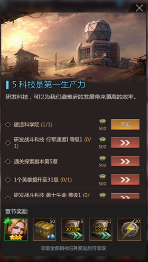 3、完成后续章节任务,熟悉基本操作和大致的玩法。这里面有不少建筑升级的任务,所以要一开始就买建筑研发套,这样从一开始节省资源。
