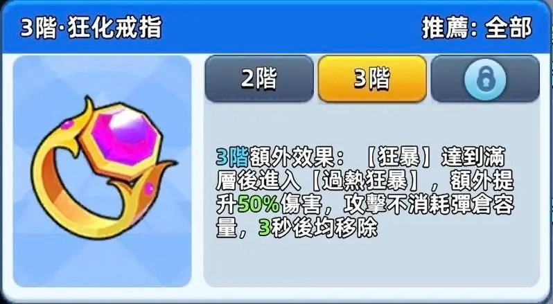 老朋友们就不多赘述啦,这款堪称最强的增伤神器,3阶时新增了2.5秒的不减攻速时长,这下与狂暴套装的适配度更高了。